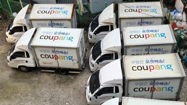 14日,首尔一处Coupang仓储基地停放着多辆配送车辆。【图片来源 韩联社】