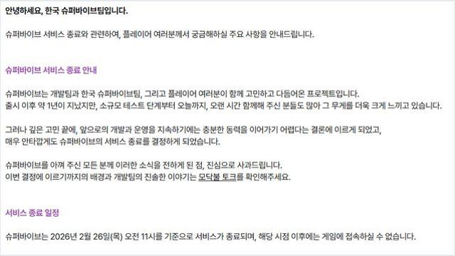 제작진은 공지사항을 통해 “플레이어 여러분께 큰 아쉬움과 상심을 안겨 드리게 되어 무거운 마음을 감출 수 없다”며, “플레이어 여러분과 함께했던 모든 시간은 저희에게 무엇과도 바꿀 수 없는 소중한 시간이었습니다”라고 전했다. 이어 “부족한 점도 많았고 기대에 충분히 부응하지 못했던 순간들도 있었지만, 슈퍼바이브와 끝까지 함께해 주신 모든 플레이어 여러분께 진심으로 감사드린다”고 덧붙였다.