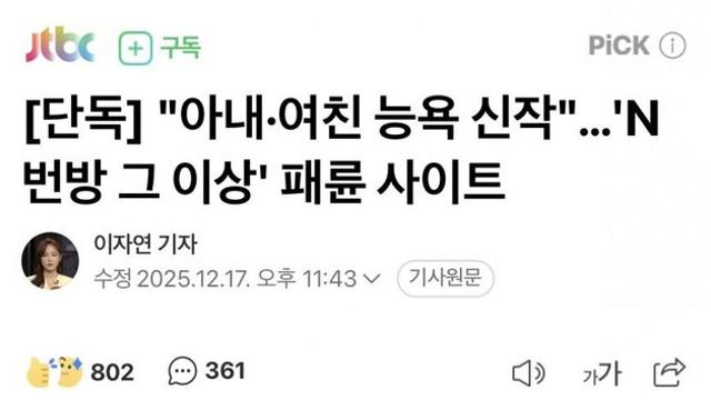 “아내·여친 능욕 신작”…’N번방 그 이상’ 패륜 사이트 NEWSPIC 2025년 12월 18일 Leave a Comment on “아내·여친 능욕 신작”…’N번방 그 이상’ 패륜 사이트 Posted in 스토리 내용: Author: NEWSPIC