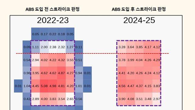 ABS 도입 전인 2022-2023년 좌측 상단 스트라이크 판정 비율은 1.11%였으나 올해엔 3.28%로 늘었다.