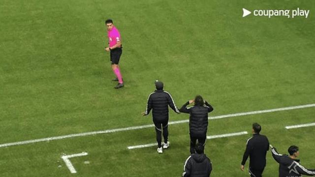 전북현대 타노스 코치와 주심이 8일 전북현대-대전하나시티즌의 하나은행 K리그1 2025 36라운드 경기에서 설전을 벌이고 있다. /사진=쿠팡플레이