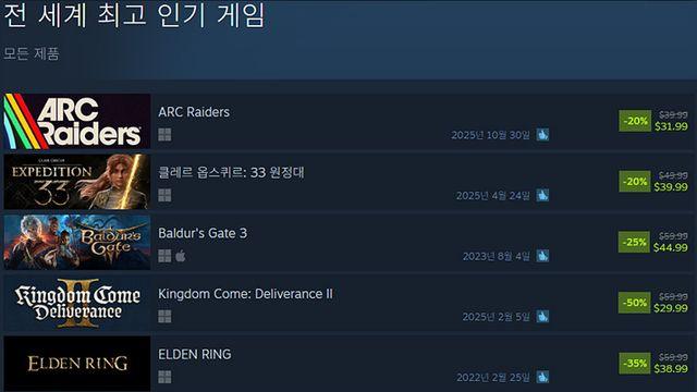 스팀의 올해 마지막 대형 이벤트인 겨울 할인이 시작됐다. 1월 5일까지 계속되는 할인 첫 날, 전 세계 최고 인기 게임 최상위에 있는 게임을 살펴봤다. 먼저 눈에 띄는 것은 첫 할인을 시작한 게임이다. 출시 이후부터 1위를 여러 차례 차지하며 최상위권을 유지 중인 아크 레이더스는 첫 20% 세일을 시작해 1위 자리를 굳혔다. 또한 지난 17일부터 겨울 테마 환경을 업데이트하고 초기화 시스템과 신규 이벤트를 시작했다. 엘든 링 밤의 통치자 또한 첫 할인을 시작하며 7위를 차지했다. 아크 레이더스보다 먼저 출시됐음에도 할인하지 않고 있었으나, 겨울 행사와 함께 25% 저렴하게 구매할 수 있다