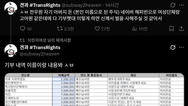 전두환 손자 전우원이 아버지 재산 팔아서 기부했다고 함 NEWSPIC 2025년 12월 19일 Leave a Comment on 전두환 손자 전우원이 아버지 재산 팔아서 기부했다고 함 Posted in BBC News 내용: 기부내역에 518재단은 물론이고 장애인,여성인권 관련 센터나 법인에도 기부하는 모습 Author: NEWSPIC