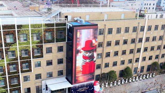 서관 엘리베이터 외벽에 설치된 대형 미디어캔버스(폭 6.5m, 높이 15m)에 입체감을 느낄 수 있는 ‘산타 고양이’가 나타나자 전시장 곳곳에서 신기하다는 듯 탄성이 잇따랐다.