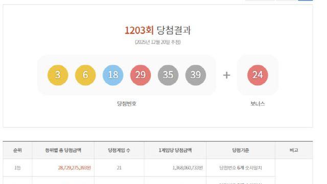 [이데일리 박종화 기자] 제1203회 로또복권 추첨에서 1등 당첨자가 21명 나왔다. 당첨금은 한 사람당 13억 6806만 원이다.