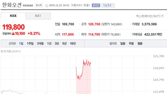 23일 한국거래소에 따르면 오전 10시 21분 기준 한화오션 주가는 전 거래일 대비 9.21%(1만100원)오른 11만9천800원에 거래되고 있다. 트럼프 대통령이 전날(현지시간) 플로리다 마러라고에서 ‘골든 플리트(Golden Fleet·황금 함대)’ 구상을 발표하며 “미 해군이 추진하는 완전히 새로운 급의 프리깃함을 한국의 한화와 협력해 건조할 예정”이라고 직접 언급한 영향으로 풀이된다.