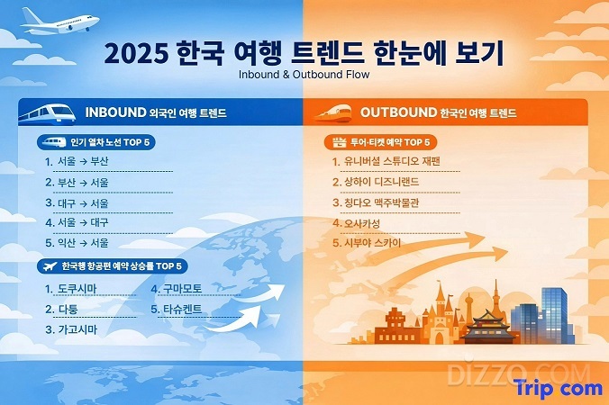 트립닷컴이 발표한 2025년 한국 여행 트렌드는 인바운드와 아웃바운드 전반에서 여행자의 선택 기준이 정교해지고 있음을 보여준다. 외국인 방한 수요는 대도시 중심에서 벗어나 도쿠시마, 다퉁, 가고시마 등 소도시로 다변화되고 있으며, 여행 정보 탐색 단계에서는 서울타워 같은 랜드마크를 조회하다가도 실제 예약 단계에서는 ‘와일드 와일드 쇼’, ‘해운대 블루라인 파크’ 같은 지역 체험 콘텐츠를 선택하는 패턴이 뚜렷하게 나타났다.
