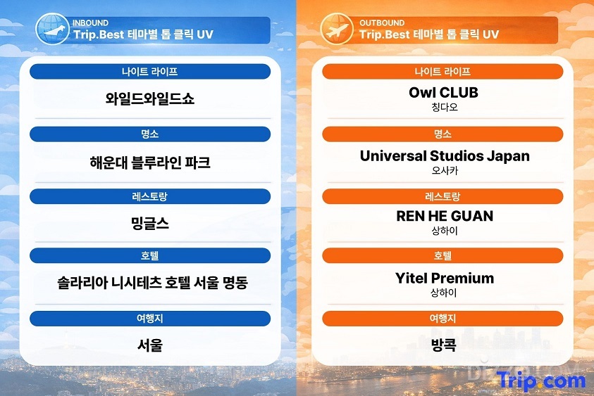 인바운드 여행자의 소비 행태에서도 여행 준비 단계에 따라 뚜렷한 차이를 보였다. 트립닷컴의 인공지능 기반 여행 랭킹 서비스인 트립.베스트(Trip.Best) 데이터에 따르면, 여행 정보를 탐색하는 초기 단계에서는 서울타워, 명동 난타 공연 등 한국을 대표하는 랜드마크와 공연 콘텐츠가 조회수 기준 상위권을 유지하며 높은 관심을 받은 것으로 나타났다.