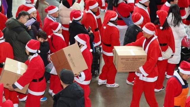 25日,在仁川中区举办的圣诞庆典上,装扮成圣诞老人的志愿者们向社会弱势群体赠送礼物。【图片提供 韩联社】