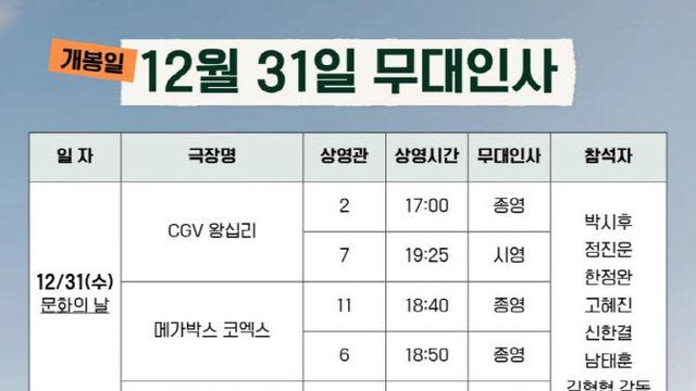 개봉 첫 주말에는 지방 관객들을 찾아간다. 1월 2일에는 메가박스 대전신세계아트앤사이언스, 롯데시네마 대전(백화점), CGV 대전터미널을 방문해 충청권 관객들의 마음을 사로잡을 계획이다.